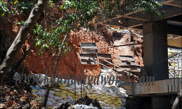 It is learnt that the construction works are of a government project and is entrusted to a private company. The same wall behind the building had collapsed ten months ago, damaging the nearby road and not yet repaired yet.
