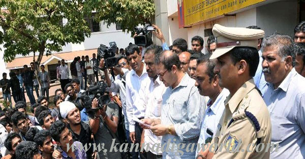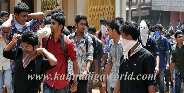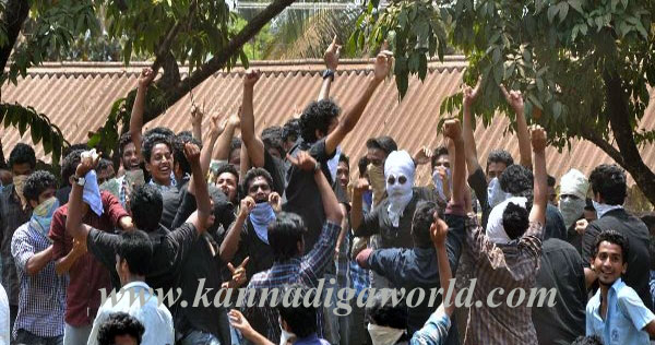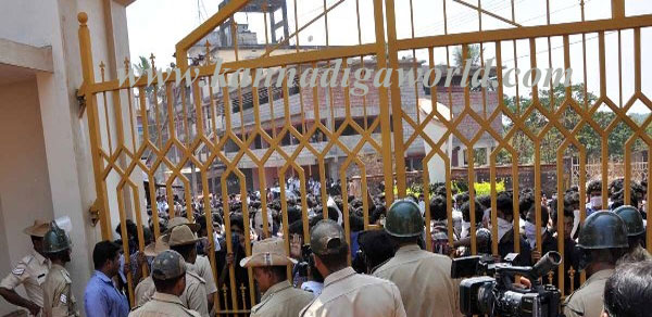 When the students started pelting stones, Konaje police resorted to mild lathi charge and drove away the protesting students out of the college premises. However, the students did not stop and they damaged the name board of the college and window panes of security guard’s booth by pelting stones. They also assaulted the videographer who was recording the protest for the police.