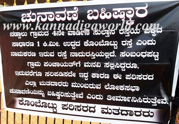 Nadsalu is a place at Padubidri, the roads here are terrible. There are many families living here. The people of this place have displayed a banner which shows their rejection to elections.
