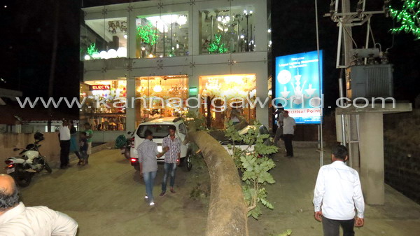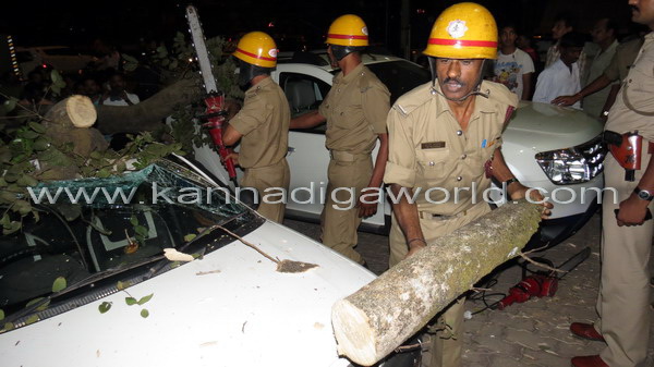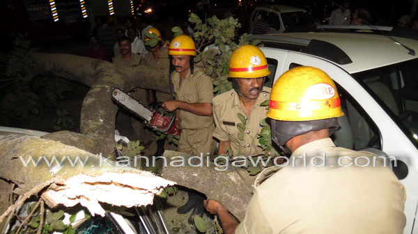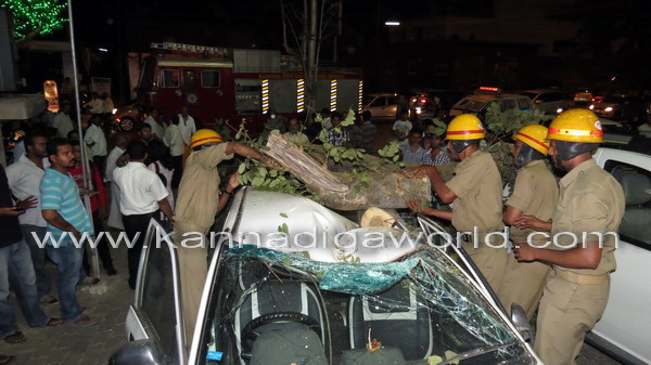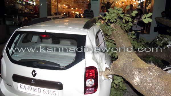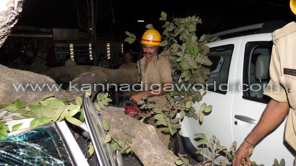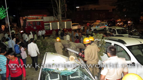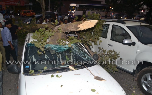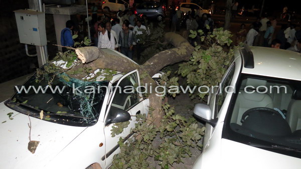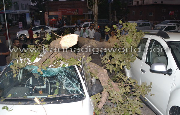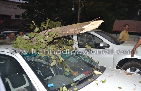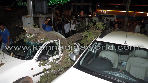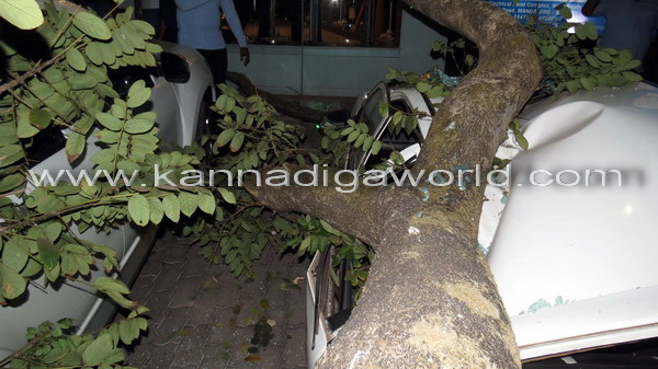 Mangalore, April 1: A huge tree rolled over a three parked vehicles damaging it completely near the Bunts Hostel Circle on March 31, Monday evening.