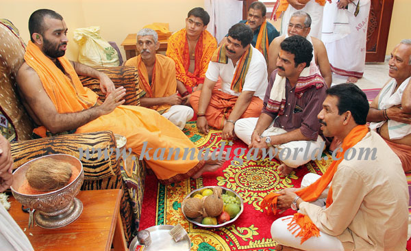 Mangalore, April 3: Nalin Kumar Kateel, Sitting MP and BJP candidate from Dakshina Kannada Lok Sabha constituency met and soght blessings of Srimad Samyameendra Theetha Swamiji, junior pontiff and successor of Srimad Sudhindra Theertha Swamiji of Kashi Mutt Samsthan on April 3, Thursday.