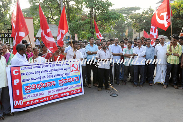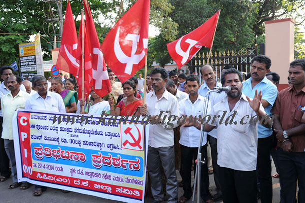 Mangalore, Apr 23: CPI(M) staged a demonstration in front of the DC office in the city on April 22 Tuesday, condemning the killing of Kabeer from Jokatte by personnel of the Anti-Naxal Force near Shringeri check post.