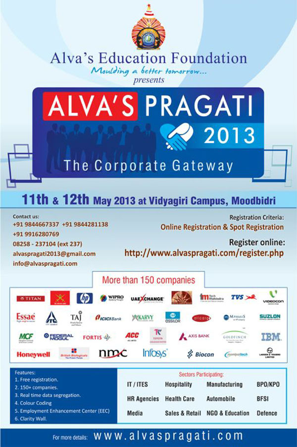 Alva’s pragati-2013 will be held on 11th & 12th of May 2013 at Vidyagiri Campus, Alva’s Degree College,Moodbidri with the hopes of 150+companies participation spanning across sectors like IT/ITeS,Hospitality,Manufacturing,Automobile,Healthcare,BFSI,MEDIA,Sales&Retail,BPO/KPO,HR,agencies and Defence.