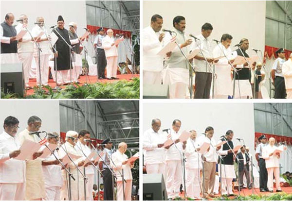 Governor H.R. Bhardwaj administered the oath of office and secrecy in batches at Raj Bhavan in city centre as supporters of the new ministers loudly cheered them.