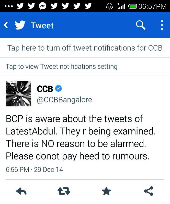 The boy, who is a 1st year engineering student, created a fake account using the name Abdul Khan and claimed responsibility for Sunday’s blast on Church Street. He also tagged Union home minister Rajnath Singh in a tweet where he said that there will be more blasts if pro ISIS Twitter handler Mehdi Biswas is not released. In one tweet he said, “I am Abdul the one behind Bangalore blast yesterday. In 2 days 2 more blast. I challenge catch me if you can. Police my foot. ISIS (Sic.)”