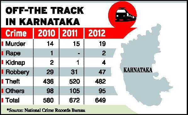The National Crime Records Bureau (NCRB) said 19 murders were reported during 2012 in Karnataka within the railway premises against 15 in 2011 and 14 in 2010. Two rapes were reported in 2012 whereas not a single case was reported in 2011. One was reported in 2010.