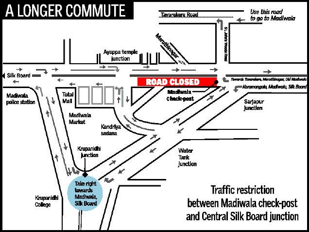 Those proceeding towards Old Madiwala Maruti Nagar from Central Silk Board should travel along Madiwala police station junction to reach Sarjapur junction and then move towards St. John’s Wood Road, Oracle building, to take a left and proceed to Tavarekere Road.