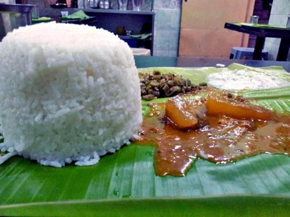 A series of conspicuous boards on your way will guide you, promising “Veg Homely Meals”. They do not lie. Located in a small room in the owner’s house, Iyer Mess is essentially a series of tables, each topped with banana leaves. As soon as you are seated, the food begins to materialise: rice, shaped into a careful mound, soon to be vehicle for tangy sambar and spicy rasam. A veggie curry (beans, on the day I visited), lime pickle, a fresh raitha with cucumbers and onions, and a little plastic container of thick yoghurt. Top that off with a giant papad, and you’ve got yourself a satisfying, simple meal, a steal at Rs. 45.