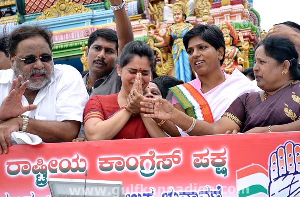 Mandya, Aug 12, 2013: Actor Ramya was overcome with emotion when she went around the town in a open vehicle on Monday, canvassing for votes for the August 21 byelection to the Mandya Lok Sabha constituency. Ramya is the Congress candidate for the election necessitated by the resignation of Cheluvarayaswamy as MP, after he was elected to the Assembly.