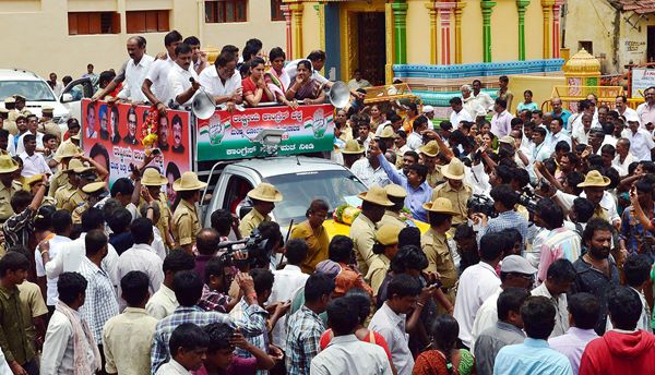 The actor hit the campaign trail after offering prayers at the Kalikamba temple. She did not speak a word even as her fans tried to shake hands with her. Actor Ambareesh was seen shaking hands with the supporters, who garlanded him.