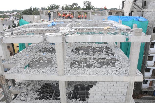 Bangalore, August 28: Demolition of the multi-storeyed building that caved in last week at Someshwaranagar has begun. The Bruhat Bangalore Mahanagara Palike (BBMP), which had earlier planned to demolish the structure using specialised equipment, has now resorted to demolishing the building manually.