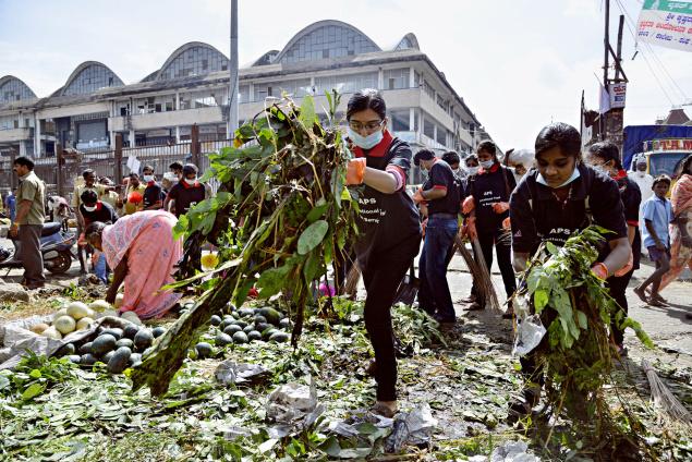 When such is the case, cleaning the market is quite a task. So, recently the civic authorities decided to do spring cleaning of the place by roping in students and non-governmental organisations. In the first such effort, as many as 500 students from Acharya Patashala institutions joined hands with the Bruhat Bangalore Mahanagara Palike authorities. So, on Monday morning, young and sprightly students, armed with rubber gloves, masks and brooms, put in their best efforts to clean K.R. Market. The students worked really hard from 8 a.m. till noon and assisted the BBMP personnel to clear the garbage lying all around the market.