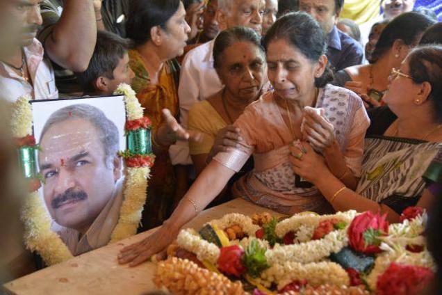 Family members brought the body from the Bangalore International Airport to their house in Hejjala around 12.30 p.m. A pall of gloom settled over the house where a large number of relatives, friends and business colleagues had gathered. Family members said that the body would later be taken to the Banashankari crematorium.