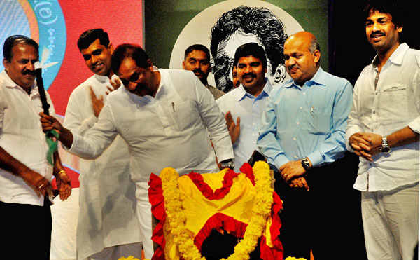 Bangalore, Oct 27, 2013, dhns: Remembrance: (From left) Home Minister K J George, advocate K Diwakar and legislator Madhu Bangarappa at the birth anniversary of former chief minister S Bangarappa in Bangalore on Sunday. dh photo