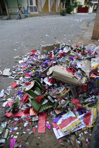 In most residential areas, cracker waste formed an additional layer over the roads with people having kicked off celebrations on Saturday with fireworks. To make things worse, most road corners had bins or garbage piles with an excess of festival waste — from puja items to sweet boxes and plantain leaves.