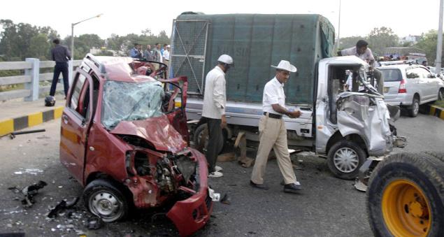 The car was heading towards Laggere from Nagarabhavi. Eyewitnesses reportedly told the police that the driver of the speeding car hit the median and jumped on the opposite track ramming a multi-utility vehicle and a goods carrier before coming to a halt.