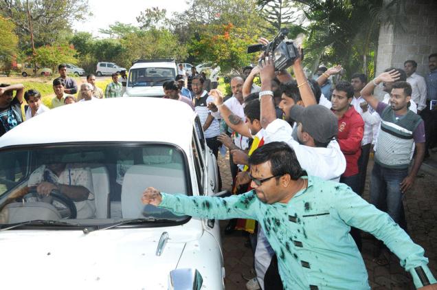 They threw black paint on him when he arrived to inaugurate a symposium organised by the University of Mysore on the Manasagangotri campus.
