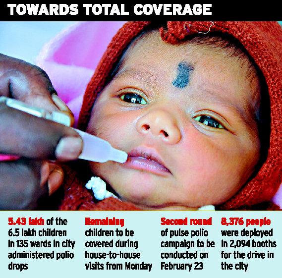 polioAs many as 5.43 lakh of the 6.5 lakh children below the age of five were on Sunday administered polio drops as part of Pulse Polio immunisation drive in the areas coming under the Bruhat Bangalore Mahanagara Palike in the city. With this, the city achieved 83.56 per cent coverage in 135 wards covered by the BBMP.