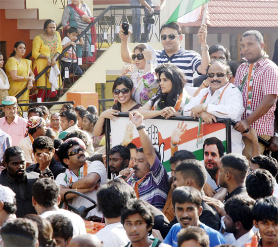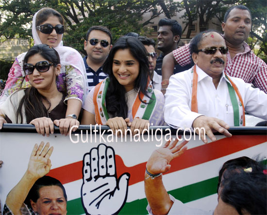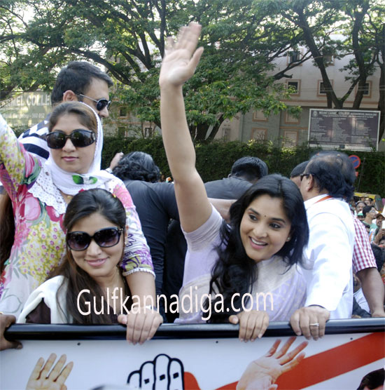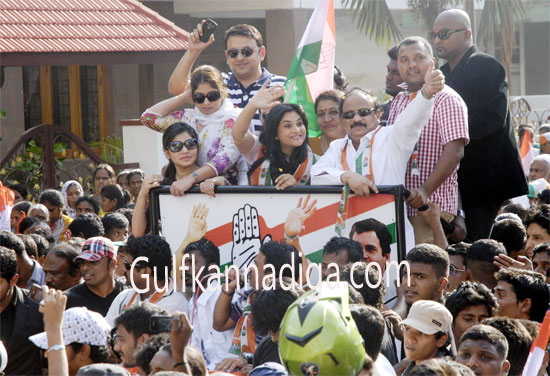 Hundreds of party workers, including supporters, who had gathered at Mount Carmel College Circle were thrilled by the sight of the Kannada film actor Ramya, dressed in a pale pink saree, standing atop a jeep with Baig and close friends. As the campaign made its way into residential areas, hundreds left their homes and joined the procession to catch a glimpse of Ramya.
