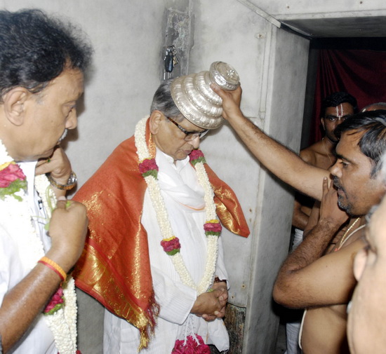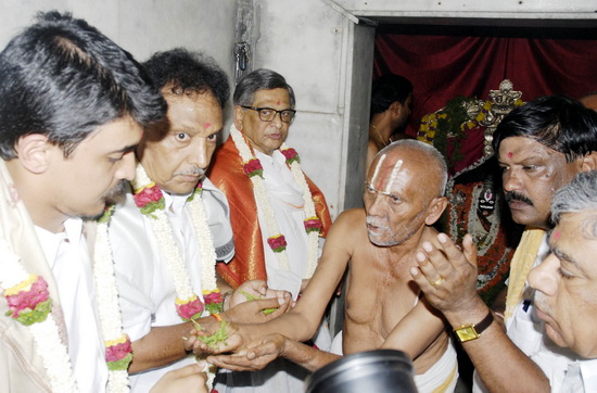 Later, addressing a huge crowd gathered outside the temple along with the father- son candidate by his side, Mr. Krishna used the opportunity to read out a long list of schemes introduced during his tenure as Chief Minister.