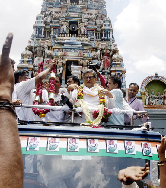 Even as the former Minister arrived two hours after the scheduled time, party workers and residents continued to wait patiently in the blazing sun. Mr. Krishna was welcomed by Congress workers amid loud firecrackers with Congress flags flying high up in the air. He first visited the Lakshminarasimha temple and performed rituals before kick-starting his campaign for M. Krishnappa contesting elections from Vijayanagar and his son Priyakrishna who is contesting from Govindrajnagar.