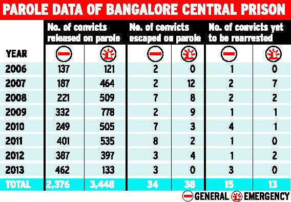 While 137 convicts were granted general parole in 2006 in Bangalore prison, the number increased to 462 in 2013.