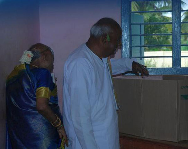 Mr. Revanna, as he did in the previous assembly elections, changed the position of the table on which the electronic voting machine was placed before voting. He shifted the table little towards a window, to give an impression that he wanted more light to view the EVM. Voters had gathered in large numbers around the polling station where Gowda’s family had arrived to vote. Many aged men and women were seen in the queue.