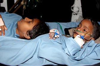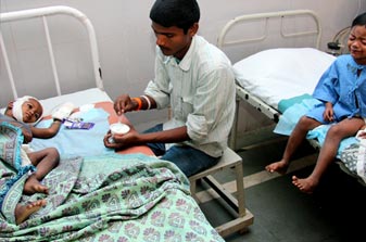 A girl who was injured during the collapse of a residential building, rests with a social worker on a hospital bed in Thane district, on the outskirts of Mumbai. (Reuters)