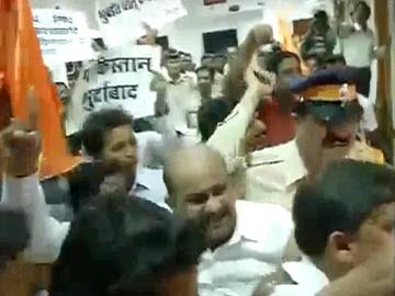 The Shiv Sena workers were carrying placards and saffron flags; they moved with relative ease past the policemen posted outside, a standard precaution in Mumbai where the Sena regularly disrupts or protests against the presence of Pakistani artists.