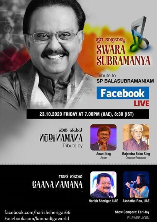 ದುಬೈಯ ಖ್ಯಾತ ಉದ್ಯಮಿ, ಕನ್ನಡ, ತುಳು ಚಿತ್ರ ನಿರ್ಮಾಪಕ, ಗಲ್ಫ್ ರಾಷ್ಟ್ರಗಳಲ್ಲಿ ಜ್ಯೂನಿಯರ್ ಎಸ್.ಪಿ.ಬಿ ಎಂದೇ ಖ್ಯಾತರಾಗಿರುವ ಪ್ರಸಿದ್ಧ ಗಾಯಕ ಶ್ರೀ ಹರೀಶ್ ಶೇರಿಗಾರ್ ಅವರು ಫೇಸ್ ಬುಕ್ ಲೈವ್ ನಲ್ಲಿ ಎಸ್.ಪಿ,ಬಿ ಅವರ ಹಾಡುಗಳನ್ನು ಹಾಡುವ ಮೂಲಕ ಇತ್ತೀಚೆಗೆ (ಸೆಪ್ಟಂಬರ್.25) ಇಹಲೋಕ ತ್ಯಜಿಸಿದ ಬಹು ಭಾಷಾ ನಟ, ಸಂಗೀತ ಲೋಕದ ದಿಗ್ಗಜ, ಸ್ವರ ಸಾಮ್ರಾಟ, ಮಹಾನ್ ಗಾಯಕ ಎಸ್ ಪಿ ಬಾಲಸುಬ್ರಹ್ಮಣ್ಯಂ ಅವರಿಗೆ ಗೌರವ ಶೃದ್ಧಾಂಜಲಿ ಅರ್ಪಿಸಲಿದ್ದಾರೆ.