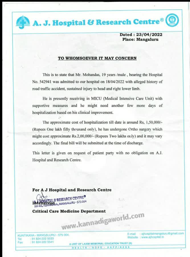 ಕಲ್ಲಡ್ಕದ 19 ವರ್ಷ ಪ್ರಾಯದ ಮೋಹನದಾಸ್ ಎಂಬ ತರುಣ ಅಪಘಾತದಲ್ಲಿ ಗಂಭೀರವಾಗಿ ಗಾಯಗೊಂಡಿದ್ದಾರೆ. ಮಂಗಳೂರಿನ ಎ.ಜೆ. ಆಸ್ಪತ್ರೆಯಲ್ಲಿ ಯುವಕ ಚಿಕಿತ್ಸೆಗಾಗಿ ದಾಖಲಾಗಿದ್ದು ಐಸಿಯು ನಲ್ಲಿ ಚಿಕಿತ್ಸೆ ಕೊಡಿಸಲಾಗುತ್ತಿದೆ. ತಲೆ, ಕೈ ಕಾಲು ಭಾಗಕ್ಕೆ ಗಂಭೀರ ಏಟಾಗಿದೆ. ಕಳೆದ ವಾರ ಈ‌ಅಪಘಾತ ಸಂಭವಿಸಿತ್ತು ಈಗಾಗಾಲೇ ಒಂದೂವರೆ ಲಕ್ಷ ರೂಪಾಯಿ ಈತನ ಬಡ ಕುಟುಂಬ ಚಿಕಿತ್ಸೆಗಾಗಿ ಖರ್ಚು ಮಾಡಿದ್ದು ಇನ್ನು 2 ಲಕ್ಷ ರೂಪಾಯಿಗೂ ಅಧಿಕ ಮೊತ್ತ ಅಗತ್ಯವಿದೆ. ಈತನಿಗೆ ಆರ್ಥೋ ಸರ್ಜರಿ ಮಾಡಿಸಬೇಕಾದ ಅಗತ್ಯವಿರುವ ಬಗ್ಗೆ ವೈದ್ಯರು ತಿಳಿಸಿದ್ದು ಬಡ ಕುಟುಂಬ ಇದರಿಂದ ಚಿಂತೆಗೀಡಾಗಿದೆ.