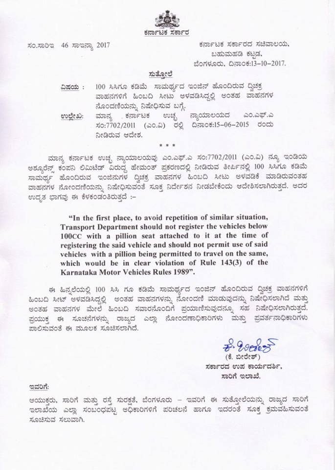 ಕರ್ನಾಟಕ ಹೈಕೋರ್ಟ್‌ನ ಇತ್ತೀಚಿನ ಆದೇಶದ ಅನುಸಾರ , 100 ಸಿಸಿ.ಗೆ ಕಡಿಮೆ ಎಂಜಿನ್ ಸಾಮರ್ಥ್ಯದ ದ್ವಿಚಕ್ರ ವಾಹನಗಳಲ್ಲಿ, ಹಿಂಬದಿ ಸವಾರರ ಸೀಟು ಹೊಂದಿರುವ ದಿಚಕ್ರ ವಾಹನಗಳ ನೋಂದಣಿ ಮಾಡದಂತೆ ಎಲ್ಲಾ ಪ್ರಾದೇಶಿಕ ಸಾರಿಗೆ ಅಧಿಕಾರಿಗಳಿಗೆ ಸಾರಿಗೆ ಇಲಾಖೆ ನಿರ್ದೇಶನ ನೀಡಿದೆ. ಅದಾಗ್ಯೂ ಸೀಟು ಅಳವಡಿಸಿದಲ್ಲಿ ವಾಹನ ಜಪ್ತಿ ಮಾಡಲು ಆದೇಶಿಸಲಾಗಿದೆ. ಈಗಾಗಲೇ ರಸ್ತೆಯಲ್ಲಿ ಓಡಾಡುತ್ತಿರುವ ಬೈಕ್​ಗಳಿಗೆ ಇದು ಅನ್ವಯವಾಗುವುದಿಲ್ಲ. ಹೊಸದಾಗಿ ಖರೀದಿಸುವ ವಾಹನಗಳಿಗಷ್ಟೇ ನಿಯಮ ಅನ್ವಯವಾಗಲಿದೆ ಎಂದು ಸಾರಿಗೆ ಇಲಾಕೆ ಅಧಿಕಾರಿಯೊಬ್ಬರು ತಿಳಿಸಿದರು.