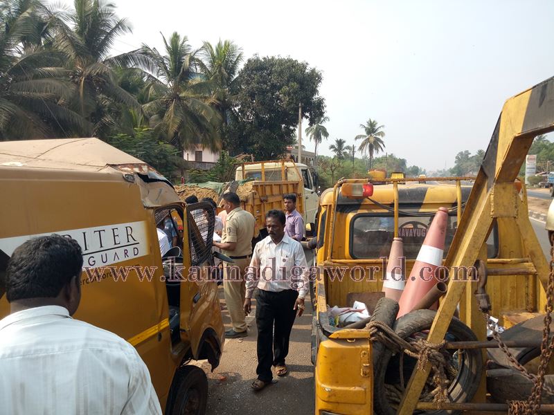 ಘಟನೆ ವಿವರ: ಮರಳು ತುಂಬಿದ್ದ ಟಿಪ್ಪರ್ ವಾಹನ ತೆಕ್ಕಟ್ಟೆ ಹೆದ್ದಾರಿಯಲ್ಲಿ ನಿಂತಿದ್ದು ಈ ಸಂದರ್ಭ ಕೋಟ ಕಡೆಯಿಂದ ಸಾಗಿ ಬಂದ ಹಣ ಸಾಗಾಟದ ವಾಹನ ಹಿಂಬದಿಯಿಂದ ಡಿಕ್ಕಿಯಾಗಿದೆ. ಡಿಕ್ಕಿ ರಭಸಕ್ಕೆ ಹಣ ಸಾಗಾಟದ ವಾಹನ ಮುಂಭಾಗ ನಜ್ಜುಗುಜ್ಜಾಗಿತ್ತು. ವಾಹನದ ಒಂದು ಪಾರ್ಶ್ವದಲ್ಲಿ ಸಿಕ್ಕಿ ಬಿದ್ದ ರಾಜೇಶ್ ಅವರನ್ನು ಹೊರತೆಗೆದು ಆಸ್ಪತ್ರೆಗೆ ಸಾಗಿಸುವುದು ಹರಸಾಹಸದ ಕಾರ್ಯವಾಗಿತ್ತು. ವಾಹನ ಚಲಾಯಿಸುತ್ತಿದ್ದ ರಾಘವೇಂದ್ರ ಕಾಲಿನ ಭಾಗಕ್ಕೂ ಗಂಭೀರ ಗಾಯವಾಗಿದೆ. ಸತತ ಪರಿಶ್ರಮದ ಮೂಲಕ ನಜ್ಜುಗುಜ್ಜಾದ ವಾಹನದಿಂದ ಇಬ್ಬರು ಗಾಯಾಳುಗಳನ್ನು ಹೊರತೆಗೆದು ಆಸ್ಪತ್ರೆಗೆ ರವಾನಿಸಲಾಯಿತು. ವಾಹನದಲ್ಲಿ ಯಾವುದೇ ಹಣ ಇರಲಿಲ್ಲ ಎನ್ನಲಾಗಿದೆ.