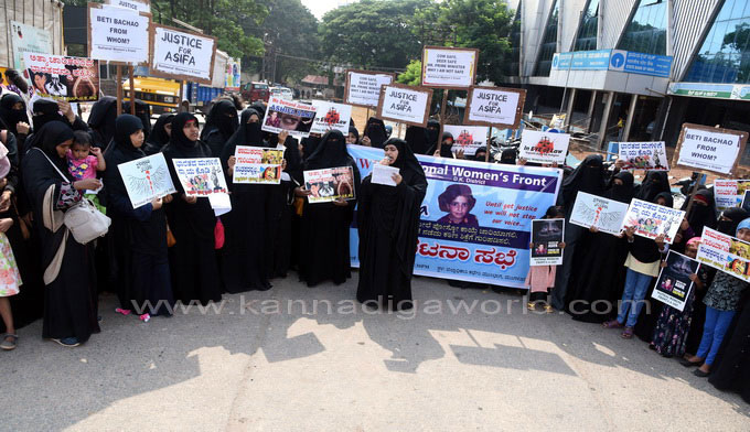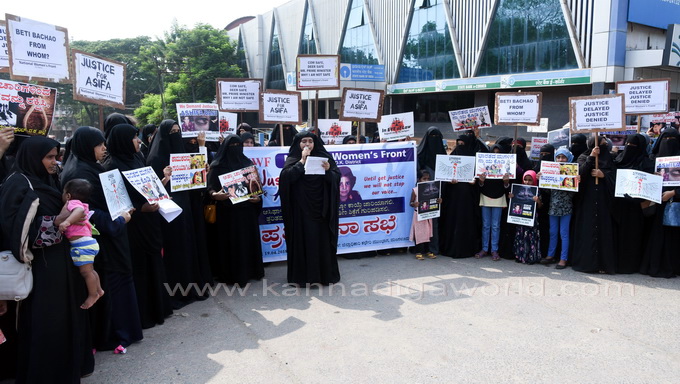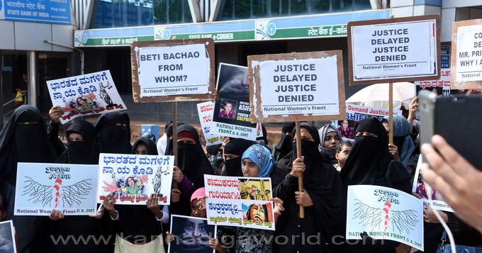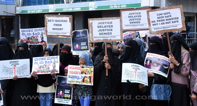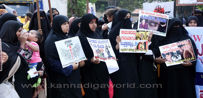 ಮಂಗಳೂರು, ಎಪ್ರಿಲ್.19: ಜಮ್ಮು ಕಾಶ್ಮೀರದ ಕಥುವಾ ಜಿಲ್ಲೆಯ 8ರ ಹರೆಯದ ಬಾಲಕಿಯ ಅತ್ಯಾಚಾರ ಮತ್ತು ಕೊಲೆ ಕೃತ್ಯವನ್ನು ಖಂಡಿಸಿ ಹಾಗೂ ನ್ಯಾಯಕ್ಕಾಗಿ ಆಗ್ರಹಿಸಿ ‘ನ್ಯಾಷನಲ್ ವಿಮೆನ್ಸ್ ಫ್ರಂಟ್’ನ ನೇತೃತ್ವಲ್ಲಿ ಗುರುವಾರ ದ.ಕ.ಜಿಲ್ಲಾಧಿಕಾರಿ ಕಚೇರಿ ಮುಂದೆ ಪ್ರತಿಭಟನೆ ನಡೆಯಿತು.