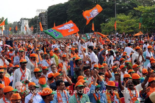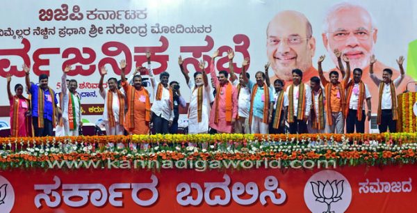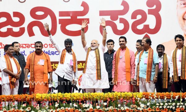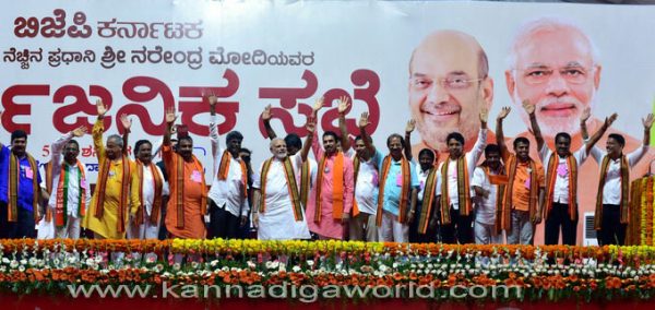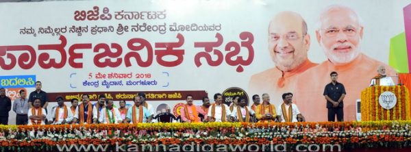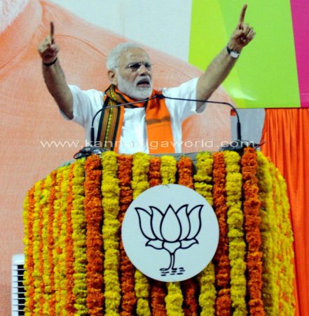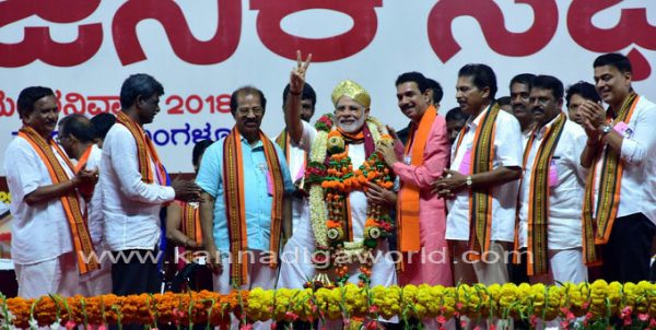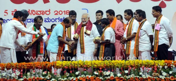 ಮಂಗಳೂರು : ಮಂಗಳೂರಿನಲ್ಲಿ ಶನಿವಾರ ಸಂಜೆ ಹಮ್ಮಿಕೊಂಡಿದ್ದ ಬಿಜೆಪಿಯ ಬೃಹತ್ ಸಮಾವೇಶದಲ್ಲಿ ಪಾಲ್ಗೊಳ್ಳಲು ಆಗಮಿಸಿದ ಪ್ರಧಾನಿ ನರೇಂದ್ರ ಮೋದಿ ಬಾಹುಬಲಿ ಹಾಡಿನೊಂದಿಗೆ ವೇದಿಕೆ ಏರಿದರು. ಮಲ್ಲಿಗೆ ಹಾರ, ಸುಪಾರಿ ಮಾಲೆ ಪೇಟದೊಂದಿಗೆ ಮೋದಿಯವರನ್ನು ಈ ವೇಳೆ ಸ್ವಾಗತಿಸಲಾಯಿತು.