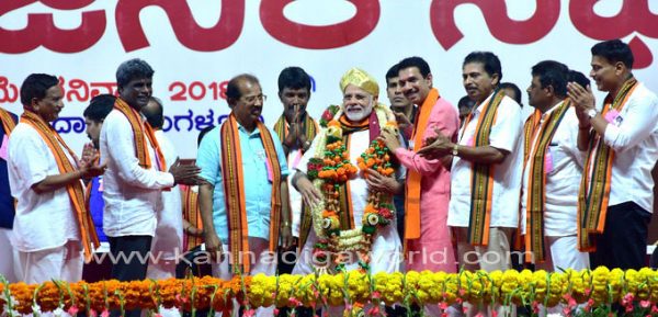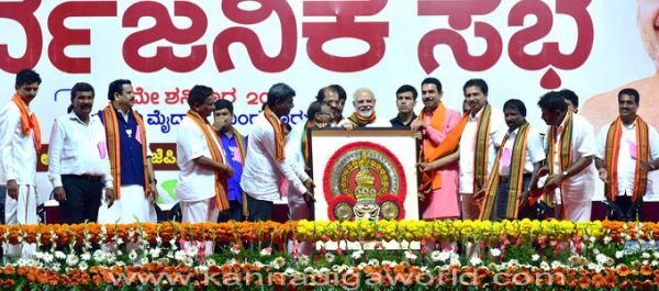 ಬಾಹುಬಲಿ ಹಾಡಿನೊಂದಿಗೆ ವೇದಿಕೆ ಏರಿದ ನರೇಂದ್ರ ಮೋದಿಗೆ ಮಲ್ಲಿಗೆ ಹಾರ, ಸುಪಾರಿ ಮಾಲೆ ಪೇಟದೊಂದಿಗೆ ಸ್ವಾಗತಿಸಲಾಯಿತು. ಮಹಾಲಸಾ ಆರ್ಟ್ಸ್ನ ಕಲಾವಿದೆ ಸೌಮ್ಯ ಅವರ ತೆಂಕುತಿಟ್ಟಿನ ಯಕ್ಷಗಾನದ ಬಣ್ಣದ ವೇಷದ ಚಿತ್ರಕಲೆಯನ್ನು ಪ್ರಧಾನಿಗೆ ಈ ಸಂದರ್ಭ ನೀಡಲಾಯಿತು. ಬಳಿಕ 7 ಗಂಟೆ ಸುಮಾರಿಗೆ ನೇರವಾಗಿ ಮಾತು ಆರಂಭಿಸಿದ ಪ್ರಧಾನಿ ಮೋದಿ ಸುಮಾರು 47 ನಿಮಿಷಗಳ ಕಾಲ ನೆರೆದ ಜನಸ್ತೋಮವನ್ನುದ್ದೇಶಿಸಿ ಮಾತನಾಡಿದರು.