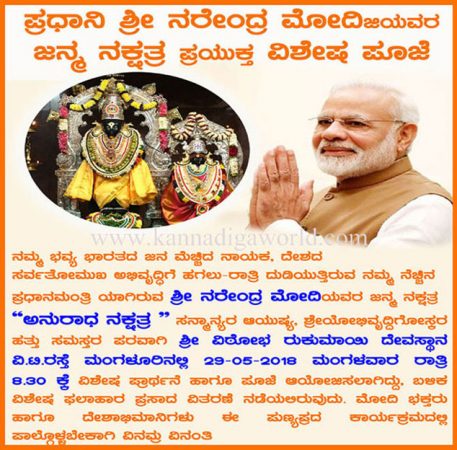 ಮಂಗಳೂರು, ಮೇ.28 : ಭವ್ಯ ಭಾರತದ ಜನ ಮೆಚ್ಚಿದ ನಾಯಕ, ದೇಶದ ಸರ್ವತೋಮುಖ ಅಭಿವೃದ್ಧಿಗೆ ಹಗಲು-ರಾತ್ರಿ ದುಡಿಯುತ್ತಿರುವ ಪ್ರಧಾನಮಂತ್ರಿ ಶ್ರೀ ನರೇಂದ್ರ ಮೋದಿಯವರ ಜನ್ಮ ನಕ್ಷತ್ರ “ಅನುರಾಧ ನಕ್ಷತ್ರ” ಪ್ರಯುಕ್ತ ಸನ್ಮಾನ್ಯರ ಆಯುಷ್ಯ, ಶ್ರೇಯೋಭಿವೃದ್ದಿಗೋಸ್ಕರ ಹತ್ತು ಸಮಸ್ತರ ಪರವಾಗಿ ಮಂಗಳೂರಿನ ವಿ.ಟಿ.ರಸ್ತೆಯಲ್ಲಿರುವ ಶ್ರೀ ವಿಠೋಭ ರುಕುಮಾಯಿ ದೇವಸ್ಥಾನದಲ್ಲಿ ನಾಳೆ (29-05-2018) ಮಂಗಳವಾರ ರಾತ್ರಿ 8.30 ಕ್ಕೆ ವಿಶೇಷ ಪ್ರಾರ್ಥನೆ ಹಾಗೂ ಪೂಜೆಯನ್ನು ಆಯೋಜಿಸಲಾಗಿದೆ.