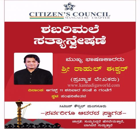 ಮಂಗಳೂರಿನ ಪ್ರತಾಪನಗರದಲ್ಲಿರುವ ಸಂಘನಿಕೇತನದಲ್ಲಿ “ಶಬರಿಮಲೆ ಸತ್ಯಾನ್ವೇಶಣೆ” ಎನ್ನುವ ವಿಷಯದ ಮೇಲೆ ರಾಹುಲ್ ಈಶ್ವರ್ ಪ್ರಧಾನ ಭಾಷಣ ಮಾಡಲಿದ್ದಾರೆ.