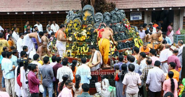 ಕಾಸರಗೋಡಿನಲ್ಲಿ ಇಂದು ಬೆಳಗ್ಗೆಯಿಂದಲೇ ಭಾರೀ ಮಳೆ ಸುರಿಯುತ್ತಿತ್ತು. ಅದನ್ನು ಲೆಕ್ಕಿಸದೆ ದೇವಾಲಯಕ್ಕೆ ಆಗಮಿಸಿದ ಭಕ್ತರು ನಾಗರ ಕಲ್ಲಿಗೆ ಪಂಚಾಮೃತ ಮತ್ತು ಕ್ಷೀರಾಭಿಷೇಕ ಮಾಡಿದರು.