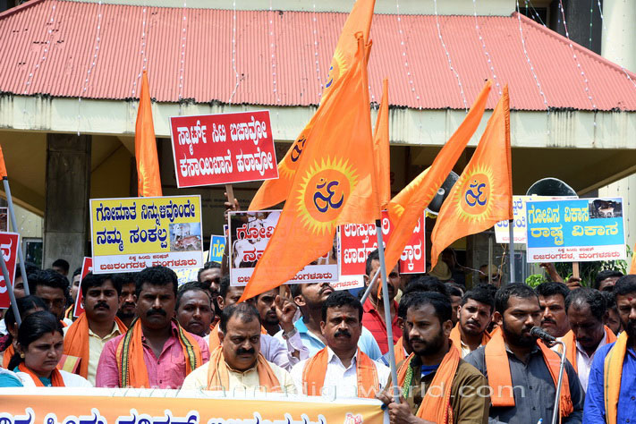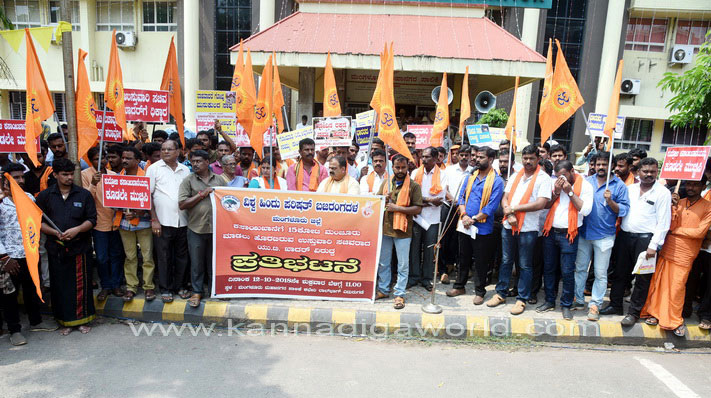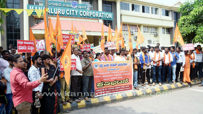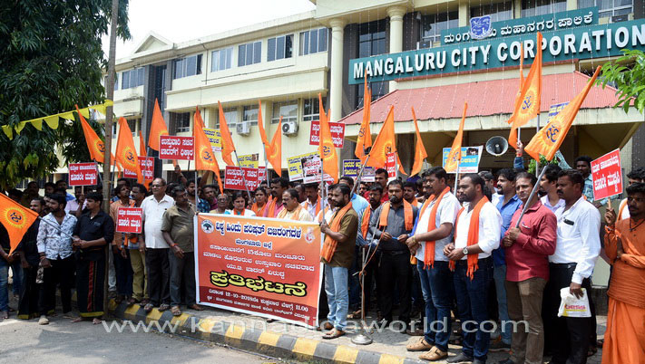 ಮಂಗಳೂರು, ಅಕ್ಟೋಬರ್.13: ಮಂಗಳೂರಿನ ಕುದ್ರೋಳಿಯಲ್ಲಿ ಕಾರ್ಯಾಚರಿಸುತ್ತಿರುವ ಕಸಾಯಿಖಾನೆಗೆ ಸ್ಮಾರ್ಟ್ ಸಿಟಿ ಯೋಜನೆಯ 15 ಕೋ.ರೂ. ಮಂಜೂರು ಮಾಡಲು ಹೊರಟಿರುವುದನ್ನು ಖಂಡಿಸಿ ದ.ಕ.ಜಿಲ್ಲಾ ಜಿಲ್ಲಾ ಉಸ್ತುವಾರಿ ಸಚಿವ ಯು.ಟಿ. ಖಾದರ್ ವಿರುದ್ಧ ವಿಶ್ವ ಹಿಂದೂ ಪರಿಷತ್ ಮತ್ತು ಬಜರಂಗದಳ ವತಿಯಿಂದ ಶುಕ್ರವಾರ ಮಂಗಳೂರು ಮಹಾನಗರ ಪಾಲಿಕೆ ಕಚೇರಿ ಮುಂಭಾಗ ಬೃಹತ್ ಪ್ರತಿಭಟನೆ ಹಮ್ಮಿಕೊಳ್ಳಲಾಯಿತು.
