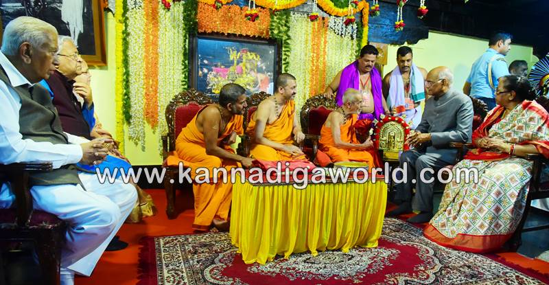 ನಂತರ ಪೇಜಾವರ ಮಠದ ಒಳಕ್ಕೆ ರಾಷ್ಟ್ರಪತಿಗಳು ಆಗಮಿಸಿದರು. ಅಲ್ಲಿ ಮೊದಲೇ ಆಗಮಿಸಿದ್ದ ಪೇಜಾವರ ಶ್ರೀ ವಿಶ್ವೇಶ್ವ ತೀರ್ಥ ಸ್ವಾಮೀಜಿಗಳು ರಾಷ್ಟ್ರ್ರಪತಿಗಳನ್ನು ಸ್ವಾಗತಿಸಿ, ಮಠದ ಇತಿಹಾಸವನ್ನು ವಿವರಿಸಿದರು. ನಂತರ ರಾಷ್ಟ್ರಪತಿಗಳು ಪೇಜಾವರ ಮಠದ ಮೂಲದೇವರು ರಾಮವಿಠಲ ದೇಗುಲದಲ್ಲಿ ಪೂಜೆ ಸಲ್ಲಿಸಿದರು. ಬಳಿಕ ರಾಷ್ಟ್ರಪತಿಗಳನ್ನು ಪೇಜಾವರ ಸ್ವಾಮೀಜಿಗಳು ಶಾಲು ಹೊದಿಸಿ, ಕೃಷ್ಣನ ಅಟ್ಟೆ ಪ್ರಭಾವಳಿ, ಯಕ್ಷಗಾನದ ಕೇದಗೆ ಮುಂಡಾಸು ತೊಡಿಸಿ ಗೌರವಿಸಿದರು. ಪೇಜಾವರ ಶ್ರೀಗಳನ್ನು ರಾಷ್ಟ್ರಪತಿಗಳು ಶಾಲು ಹೊದಿಸಿ ಗೌರವಿಸಿದರು. ಪರ್ಯಾಯ ಶ್ರೀ ವಿದ್ಯಾಧೀಶತೀರ್ಥ ಸ್ವಾಮೀಜಿ, ಪೇಜಾವರ ಮಠದ ಕಿರಿಯ ಸ್ವಾಮೀಜಿಗಳು ಉಪಸ್ಥಿತರಿದ್ದರು.