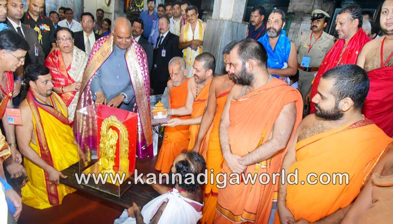 ನಂತರ ಅಲ್ಲಿಂದ ನಿರ್ಗಮಿಸಿದ ರಾಷ್ಟ್ರಪತಿಗಳು ಮದ್ಯಾಹ್ನ 12.20ಕ್ಕೆ ಕೃಷ್ಣಮಠಕ್ಕೆ ಆಗಮಿಸಿದರು. ಅಲ್ಲಿ ಅವರನ್ನು ಮಂಗಳವಾದ್ಯ ಹಾಗೂ ವೇಧಘೋಷಗಳೊಂದಿಗೆ ಸ್ವಾಗತಿಸಿ, ಕೃಷ್ಣಮಠದ ಒಳಕ್ಕೆ ಕರೆದುಕೊಂಡು ಬರಲಾಯಿತು. ಕೃಷ್ಣ ದರ್ಶನ ಪಡೆದ ರಾಷ್ಟ್ರಪತಿಗಳು, ಪಕ್ಕದಲ್ಲಿಯೇ ಅಷ್ಟಮಠದ ಸ್ವಾಮೀಜಿಗಳೊಂದಿಗೆ ಆಸೀನರಾದರು. ರಾಷ್ಟ್ರಪತಿಗಳನ್ನು ಪರ್ಯಾಯ ಶ್ರೀ ವಿದ್ಯಾಧೀಶತೀರ್ಥ ಸ್ವಾಮೀಜಿಗಳು ಸ್ವಾಗತಿಸಿದರು. ಉಡುಪಿ ಕೃಷ್ಣಮಠಕ್ಕೆ ಭೇಟಿ ನೀಡಿದ ಬಗ್ಗೆ ರಾಷ್ಟ್ರಪತಿಗಳು ತಮ್ಮ ಅತೀವ ಸಂತೋಷ ವ್ಯಕ್ತಪಡಿಸಿದರು. ಪರ್ಯಾಯ ಸ್ವಾಮೀಜಿಗಳು ರಾಷ್ಟ್ರಪತಿಗಳನ್ನು ಶಾಲು ಹೊದಿಸಿ, ಕೃಷ್ಣನ ಪಂಚಲೋಹ ವಿಗ್ರಹ ನೀಡಿ ಸನ್ಮಾನಿಸಿದರು. ಪೇಜಾವರ ಸ್ವಾಮೀಜಿಗಳನ್ನು ರಾಷ್ಟ್ರಪತಿ ಭವನಕ್ಕೆ ಆಗಮಿಸಲು ರಾಷ್ಟ್ರಪತಿಗಳು ಆಹ್ವಾನಿಸಿದರು. ಮಧ್ಯಾಹ್ನ 12.45ಕ್ಕೆ ರಾಷ್ಟ್ರಪತಿಗಳು ಕೃಷ್ಣಮಠದಿಂದ ಹೆಲಿಪ್ಯಾಡ್ಗೆ ಹೊರಟರು.