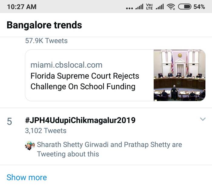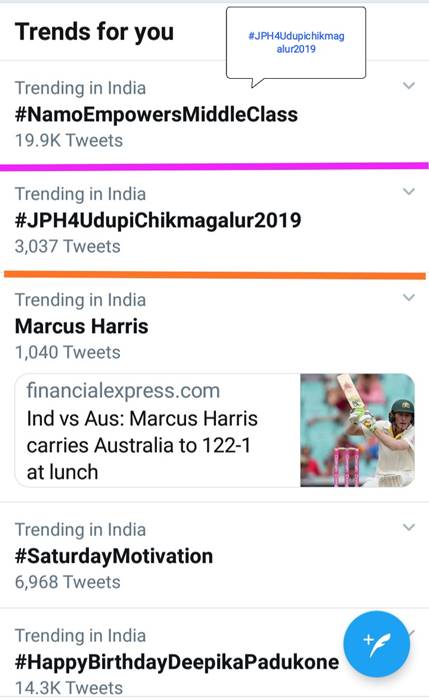 ಅವರಿಗೆ ನೀವು ಟೀಕೆಟ್ ನೀಡಿ , ಜಯಗೊಳಿಸುವುದು ನಮ್ಮ ಕರ್ತವ್ಯ ಎಂಬಂತೆ ಬಿಜೆಪಿ ಕಾರ್ಯಕರ್ತರು ಟ್ವೀಟ್ ಮಾಡಿದ್ದಾರೆ. #JPH4UdupiChikmagalur2019 ಹೆಸರಿನಲ್ಲಿ ಒಟ್ಟು ಮೂರುವರೆ ಸಾವಿರಕ್ಕೂ ಹೆಚ್ಚು ಟ್ವೀಟ್ಗಳೂ ಬಂದಿವೆ ಇನ್ನೂ ಹೆಚ್ಚುತ್ತಲೆ ಇದೆ. ಅದು ರಾಷ್ಟ್ರಮಟ್ಟದಲ್ಲಿ ಎಂಟನೇ ಸ್ಥಾನ ಮತ್ತು ರಾಜ್ಯದಲ್ಲಿ ಎರಡನೇ ಸ್ಥಾನ ಪಡೆದು ಟ್ರೆಂಡ್ ಆಗಿದ್ದು ಬಹು ಮೆಚ್ಚುಗೆಯಾಗಿತ್ತು. ಈ ಧ್ವನಿಗೆ ಸ್ಪಂದಿಸಿ ಪಕ್ಷದ ಹಿರಿಯರು ಟಿಕೇಟು ನೀಡಿದರೆ ಜೆಪಿ ಹೆಗ್ಡೆಯವರು ಈ ಬಾರಿ ಎರಡು ಲಕ್ಷಕ್ಕೂ ಹೆಚ್ಚು ಮತಗಳಿಂದ ಗೆದ್ದು ದಾಖಲೆ ನಿರ್ಮಿಸುವ ವಿಶ್ವಾಸವಿದೆ ಎಮ್ದು ಅಭಿಮಾನಿಗಳು ತಿಳಿಸಿದ್ದಾರೆ.