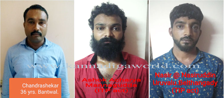 ಬಂಧಿತ ಆರೋಪಿಗಳನ್ನು ಬಂಟ್ವಾಳದ ಚಂದ್ರಶೇಖರ್ ಯಾನೆ ಚಂದ್ರು (32), ಉಪ್ಪಿನಂಗಡಿಯ ನಾಸಿರ್ (26) ಹಾಗೂ ಮಣ್ಣಗುಡ್ಡೆಯ ಅಶೋಕ (24) ಎಂದು ಗುರುತಿಸಲಾಗಿದೆ. ಲಾಡ್ಜಿನ ಮಾಲಿಕ ಅಬ್ದುಲ್ ರಜಾಕ್ , ಪಿಂಪ್ ಜೀವನ್ ತಪ್ಪಿಸಿಕೊಂಡಿರುತ್ತಾರೆ ಎಂದು ಪೊಲೀಸರು ತಿಳಿಸಿದ್ದಾರೆ.