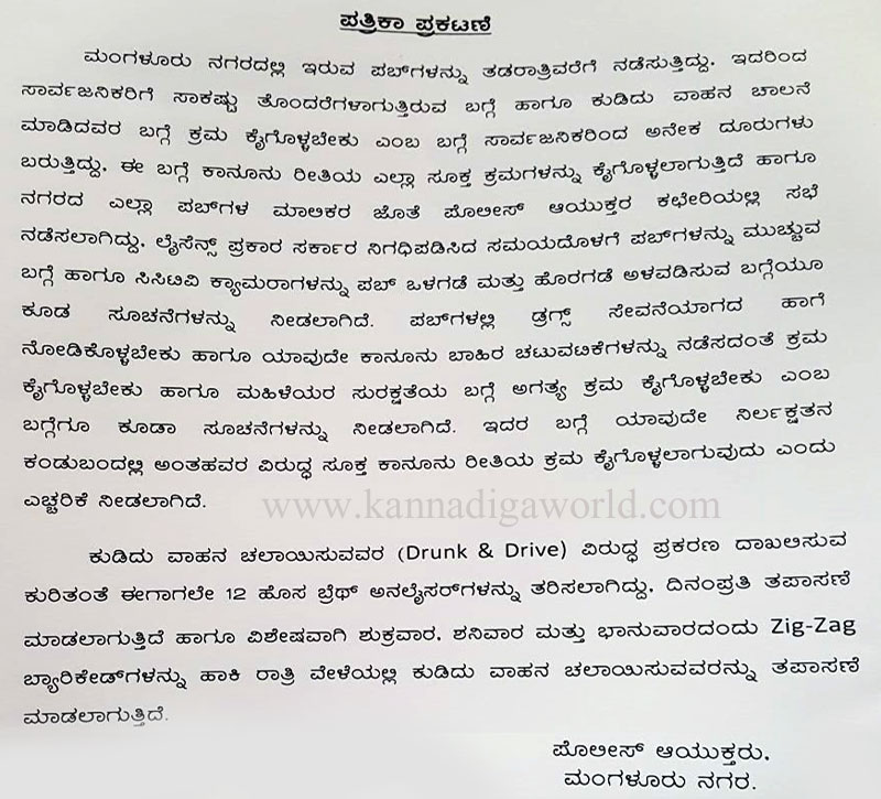 ಮಂಗಳೂರು ನಗರದಲ್ಲಿ ಸಮಯ ಮೀರಿ ಪಬ್‌ಗಳನ್ನು ನಡೆಸುತ್ತಿರುವುದು ಗಮನಕ್ಕೆ ಬಂದಿದೆ. ಪಬ್‌ಗಳಲ್ಲಿ ಕುಡಿದು ಗಲಾಟೆ ಮಾಡಿಂತಹ ಘಟನೆಗಳ ಈ ಹಿಂದೆ ನಡೆದಿವೆ. ಇದನ್ನೆಲ್ಲ ಕಡಿವಾಣ ಹಾಕಲು ಪಬ್ ಮಾಲಕರಿಗೆ ಕಾನೂನು ಪ್ರಕಾರ ನಡೆದುಕೊಂಡು ಹೋಗುವಂತೆ ಸಭೆ ಕರೆದು ಎಚ್ಚರಿಕೆ ನೀಡಲಾಗಿದೆ ಎಂದು ಆಯುಕ್ತರು ತಿಳಿಸಿದ್ದಾರೆ.