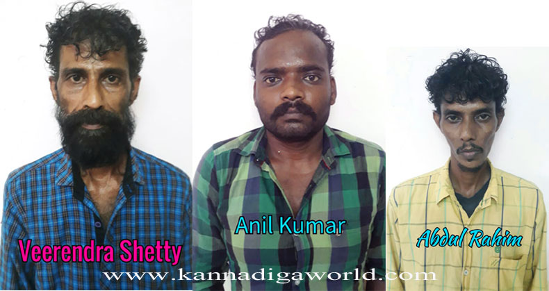 ಬಂಧಿತ ಆರೋಪಿಗಳನ್ನು ಚಿಕ್ಕಮಗಳೂರು ಜಿಲ್ಲೆಯ ಕೊಪ್ಪ ನಿವಾಸಿ ಅನಿಲ್ ಕುಮಾರ್(28), ಬೋಳಿಯಾರ್ ಗ್ರಾಮದ ವಿರೇಂದ್ರಶೆಟ್ಟಿ(46) ಹಾಗೂ ಮಂಗಳೂರು ಕಸಬಾ ಬೆಂಗ್ರೆಯ ಅಬ್ದುಲ್ ರಹೀಂ @ ಚಪ್ಪೆ ತಣ್ಣಿ ರಹೀಂ (42) ಎಂದು ಗುರುತಿಸಲಾಗಿದೆ.