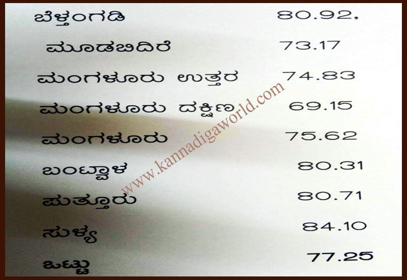ದ.ಕ.ಜಿಲ್ಲೆಯ ಎಂಟು ವಿಧಾನಸಭಾ ಕ್ಷೇತ್ರ ವ್ಯಾಪ್ತಿಯಲ್ಲಿ ಇಂದು ಸಂಜೆ 6 ಗಂಟೆಗೆ ಮತದಾನ ಪ್ರಕ್ರಿಯೆ ಮುಗಿದ ಮೇಲೆ ಬೆಳ್ತಂಗಡಿಯಲ್ಲಿ ಶೇ.80.92, ಮೂಡಬಿದ್ರೆ ಶೇ.73.17, ಬಂಟ್ವಾಳ ಶೇ. 80.31, ಪುತ್ತೂರು ಶೇ.80.71 ಸುಳ್ಯ ಶೇ.84.10, ಮಂಗಳೂರು ಉತ್ತರ ( ಸುರತ್ಕಲ್) ಶೇ.74.83, ಮಂಗಳೂರು ದಕ್ಷಿಣ ಶೇ. 69.15 ಹಾಗೂ ಮಂಗಳೂರು (ಉಳ್ಳಾಲ) ಶೇ.75.62 ಮತದಾನವಾಗಿದೆ. ಇದರಲ್ಲಿ ಬಂಟ್ವಾಳ, ಪುತ್ತೂರು, ಬೆಳ್ತಂಗಡಿ ಮತ್ತು ಸುಳ್ಯದಲ್ಲಿ ಅತೀ ಹೆಚ್ಚು ಮತದಾನವಾಗಿದೆ.