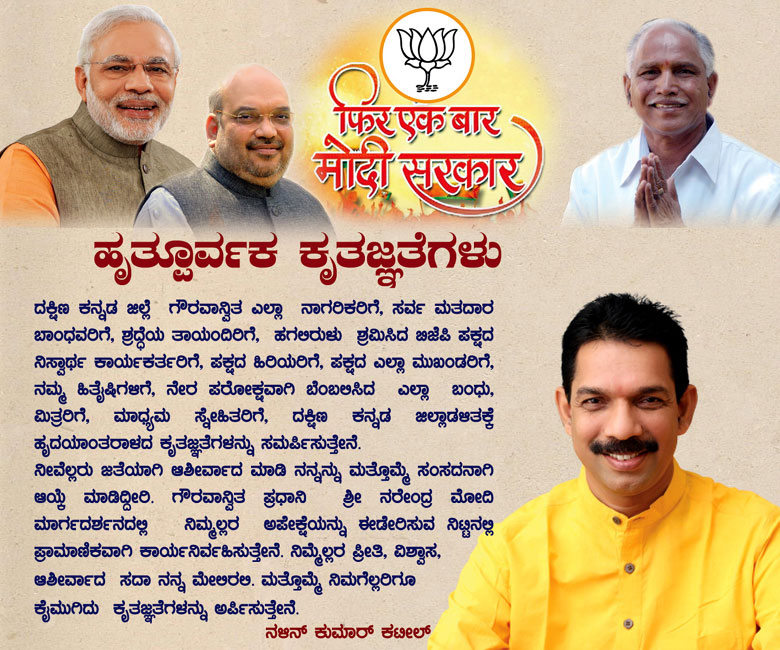 ಮಂಗಳೂರು : ದಕ್ಷಿಣ ಕನ್ನಡ ಜಿಲ್ಲೆ ಗೌರವಾನ್ವಿತ ಎಲ್ಲಾ ನಾಗರಿಕರಿಗೆ, ಸರ್ವ ಮತದಾರ ಬಾಂಧವರಿಗೆ, ಶ್ರದ್ಧೆಯ ತಾಯಂದಿರಿಗೆ, ಹಗಲಿರುಳು ಶ್ರಮಿಸಿದ ಬಿಜೆಪಿ ಪಕ್ಷದ ನಿಸ್ವಾರ್ಥ ಕಾರ್ಯಕರ್ತರಿಗೆ, ಪಕ್ಷದ ಹಿರಿಯರಿಗೆ, ಪಕ್ಷದ ಎಲ್ಲಾ ಮುಖಂಡರಿಗೆ, ನಮ್ಮ ಹಿತೈಷಿಗಳಿಗೆ, ನೇರ ಪರೋಕ್ಷವಾಗಿ ಬೆಂಬಲಿಸಿದ ಎಲ್ಲಾ ಬಂಧು, ಮಿತ್ರರಿಗೆ, ಮಾಧ್ಯಮ ಸ್ನೇಹಿತರಿಗೆ, ದಕ್ಷಿಣ ಕನ್ನಡ ಜಿಲ್ಲಾಡಳಿತಕ್ಕೆ ಹೃದಯಾಂತರಾಳದ ಕೃತಜ್ಞತೆಗಳನ್ನು ಸಮರ್ಪಿಸುವುದಾಗಿ ಈ ಬಾರಿಯ ಲೋಕಸಭಾ ಚುನಾವಣೆಯಲ್ಲಿ ಹ್ಯಾಟ್ರಿಕ್ ಗೆಲುವು ಸಾಧಿಸಿರುವ ಸಂಸದ ನಳಿನ್ ಕುಮಾರ್ ಕಟೀಲ್ ತಿಳಿಸಿದ್ದಾರೆ.
