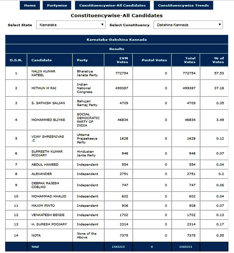 ತಮ್ಮ ಪ್ರತಿಸ್ಫರ್ಧಿ ಕಾಂಗ್ರೆಸ್ -ಜೆಡಿಎಸ್ನ ಮೈತ್ರಿ ಅಭ್ಯರ್ಥಿ ಮಿಥುನ್ ರೈಯವರು 4,99,387 ಮತಗಳನ್ನು ಪಡೆಯುವ ಮೂಲಕ 2,73,367 ದಾಖಲೆ ಮತಗಳ ಅಂತರದಿಂದ ಸೋತಿದ್ದಾರೆ. ದಕ್ಷಿಣ ಕನ್ನಡ ಕ್ಷೇತ್ರದಲ್ಲಿ ಬಿಜೆಪಿ ಅಭ್ಯರ್ಥಿ ನಳಿನ್ ಕುಮಾರ್ ಕಟೀಲ್ ಮೂರನೇ ಬಾರಿಗೆ ಅತ್ಯಧಿಕ ಮತಗಳಿಂದ ಚುನಾಯಿತರಾಗುವ ಮೂಲಕ ಪ್ರತಿಷ್ಠಿತ ಕರಾವಳಿ ಕ್ಷೇತ್ರದಿಂದ ಬಿಜೆಪಿ ನಿರಂತರ ಎಂಟನೇ ಬಾರಿಗೆ ಗೆಲುವು ಸಾಧಿಸಿ ತನ್ನ ಪ್ರಾಬಲ್ಯ ಮುಂದುವರಿಸಿದ್ದಾರೆ. ನಳಿನ್ ಕುಮಾರ್ ಕಟೀಲ್ ಅವರು ಈ ಬಾರಿ ಕೂಡ ಗೆಲ್ಲುವ ಮೂಲಕ ಹ್ಯಾಟ್ರಿಕ್ ಸಾಧನೆ ಮಾಡಿ ಇತಿಹಾಸ ಬರೆದಿದ್ದಾರೆ.