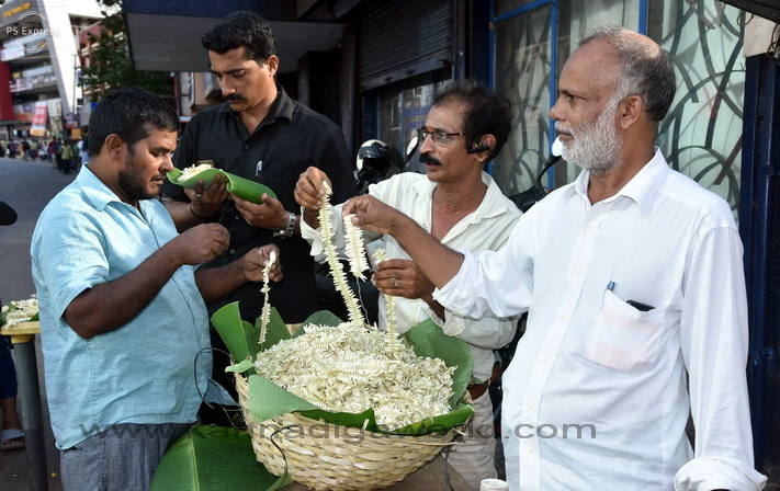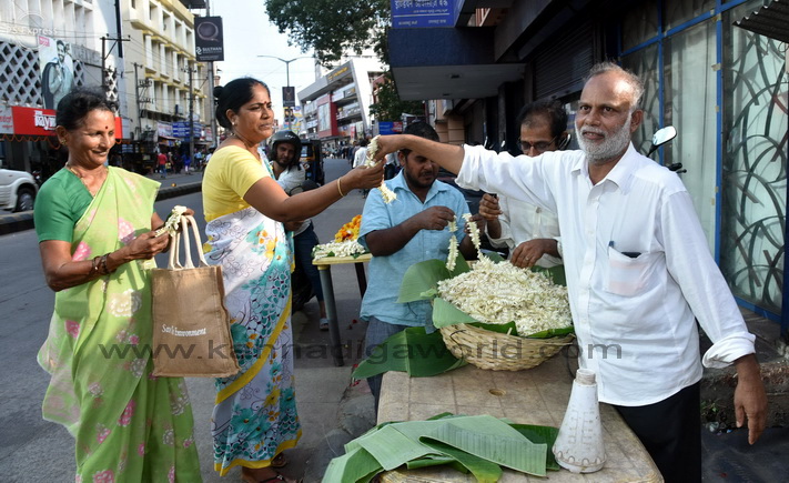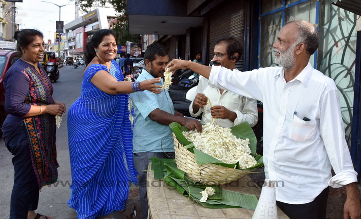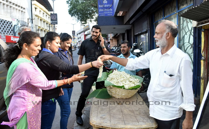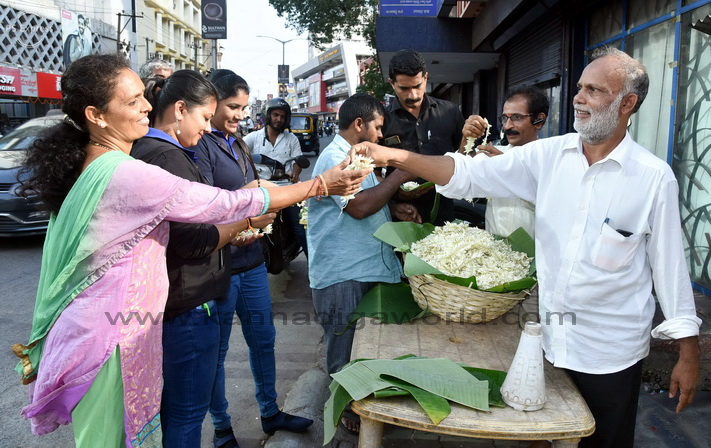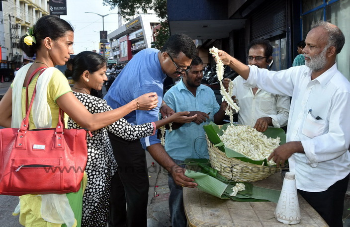ಮಂಗಳೂರಿನ ಸಿಟಿ ಸೆಂಟರ್ ಮುಂಭಾಗದ ವಸಂತಮಹಲ್ ಬಳಿ ಮಲ್ಲಿಗೆ ಹೂವಿನ ವ್ಯಾಪಾರಿ ಫಕೀರಬ್ಬ ಅವರು 100 ಅಟ್ಟೆ (400 ಚೆಂಡು) ಮಲ್ಲಿಗೆ ಹೂವನ್ನು ಮಹಿಳೆಯರಿಗೆ ಉಚಿತವಾಗಿ ಹಂಚಿದರು.